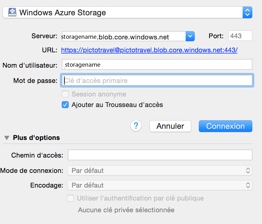 Le champ "Nom d'utilisateur" correspond au champ "Account Storage Name". Le champ "Mot de passe" est une des clés "Access Keys".
