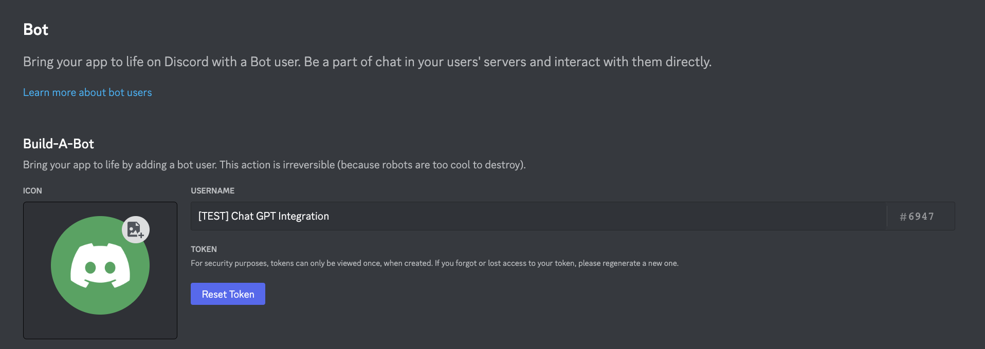 Une fois créé, notez la clé ( “token” ) du bot.
