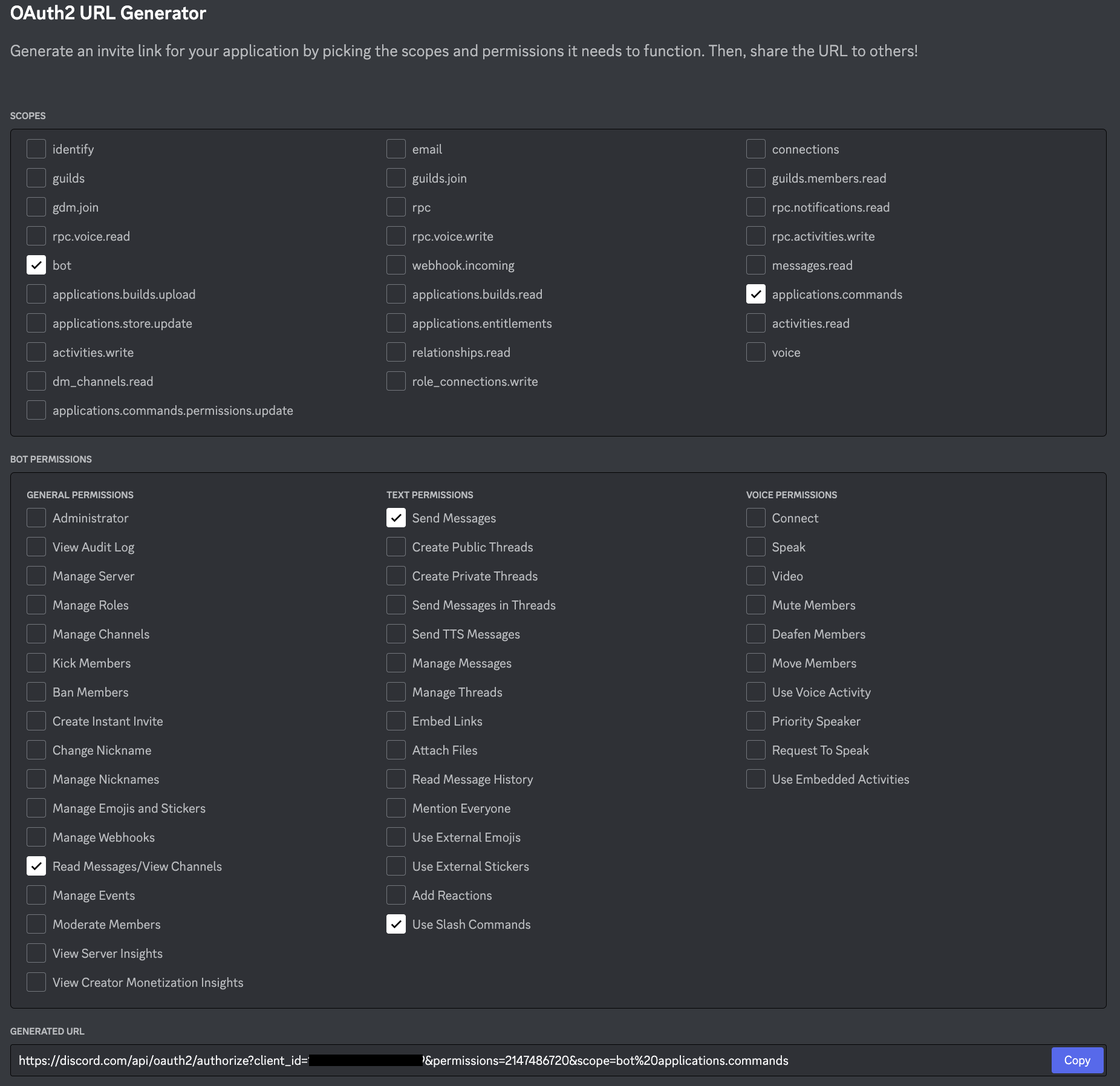 Pour configurer votre bot, vous pouvez utiliser la page "OAuth2 URL Generator". Vous devez cocher les cases correspondant aux portées et autorisations (scopes & permissions) dont votre bot a besoin pour effectuer ses tâches.