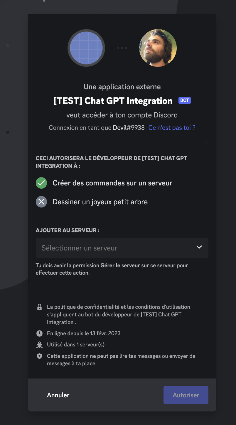 Après avoir sélectionné les paramètres nécessaires, une URL correspondante sera générée en bas de la page. Copiez cette URL et collez-la dans la barre d'adresse de votre navigateur. La page qui s'affiche vous permettra d'autoriser et d'inviter votre bot à un serveur sur lequel vous êtes administrateur.