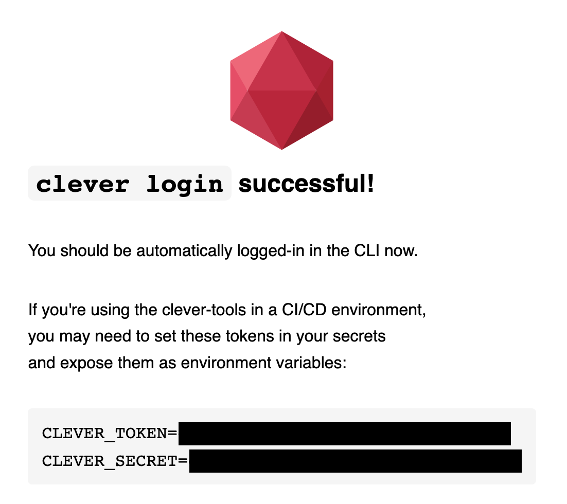 - clever login --token $CLEVER_TOKEN --secret $CLEVER_SECRET